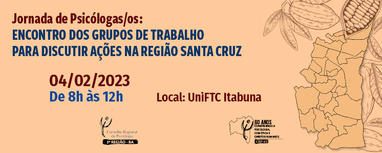 Buscando potencializar ainda mais a atuação no interior do estado e mapear a distribuição de profissionais por especialidades e serviços na região Santa Cruz, o Conselho Regional de Psicologia da Bahia (CRP-03) está promovendo um encontro de psicólogas/os/es e estudantes em Itabuna. A programação acontece no próximo dia 04 de fevereiro, de 8h às 12h, na UniFTC/Unex – localizada na Praça José Bastos, nº. 55, bairro Osvaldo Cruz. As inscrições são online e gratuitas. Haverá certificação por participação.