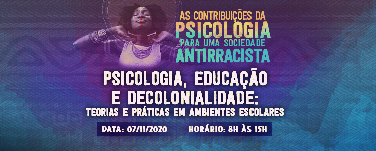 O Conselho Regional de Psicologia da Bahia (CRP-03) realiza no mês de novembro, o evento Psicologia, Educação e Decolonialidade: teorias e práticas em ambientes escolares. A atividade está marcada para o dia 07 de novembro, a partir das 8h, no canal do CRP-03 do Youtube, crp03vídeos. Com certificado de 07 horas, a transmissão é uma organização da Comissão de Direitos Humanos, juntamente com o Grupo de Trabalho de Psicologia e Relações Raciais, e o Grupo de Trabalho de Psicologia em Educação, ambos de Feira de Santana.