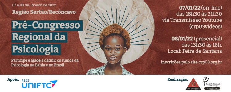 Nos dias 07 e 08/01/2022, o Conselho Regional de Psicologia da Bahia (CRP-03) realiza o Pré-Congresso Regional da Psicologia da Região Sertão/Recôncavo. O evento será semipresencial, por conta da pandemia da COVID-19.