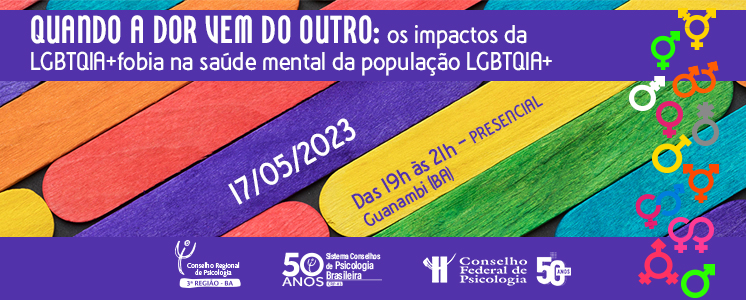 No dia Internacional de Luta contra a LGBTIfobia, 17 de maio, o Grupo de Trabalho de Interiorização de Guanambi do CRP-03 (GTI-Guanambi) e a Comissão de Interiorização do CRP-03 (COMINTER) promovem uma roda de conversa com o tema “Quando a dor vem do outro: os impactos da LGBTQIA+fobia na saúde mental da população LGBTQIA+”. Aberto ao público, o evento visa criar um espaço de debate sobre os impactos ocasionados pela LGBTQIA+fobia na saúde mental da população LGBTQIA+.