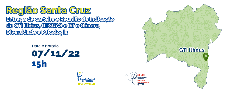 A Comissão de Interiorização (COMINTER) do Conselho Regional de Psicologia da Bahia (CRP-03) realizará mais uma entrega de Carteira de Identidade Profissional (CIP) no interior e consulta para indicação de Grupo de Trabalho de Interiorização (GTI), e dos Grupos de Trabalho Sistema Único de Assistência Social (GTSUAS) e Gênero, Diversidade e Psicologia. Dessa vez, ocorre nesta segunda-feira (07), em Ilhéus, Região Santa Cruz – Faculdade de Ilhéus, Olivença, Sala S03, Jardim Atlântico.