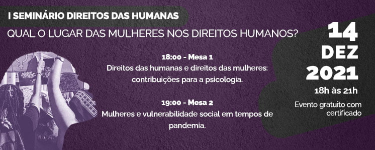 Já estão abertas as inscrições para o I Seminário Direito das Humanas: Qual o lugar das mulheres nos Direitos Humanos? O evento ocorre na próxima terça-feira (14/12), com início previsto para às 18h e transmissão pelo Youtube do CRP-03, no canal crp03vídeos. Para receber o certificado, a/o participante deve se inscrever através do Doity: https://doity.com.br/i-seminrio-direitos-das-humanas-qual-o-lugar-das-mulheres-nos-direitos-humanos/inscricao