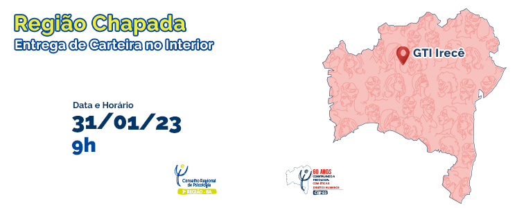 O Conselho Regional de Psicologia da Bahia (CRP-03) realizará entrega de Carteira de Identidade Profissional (CIP) em Irecê, Região Chapada, no próximo dia 31 de janeiro (terça-feira). A programação acontece a partir das 9h, no CAPS Dias Melhores – Rua Rio Branco, S/N, Recanto das Árvores, próximo à Praça da Juventude.