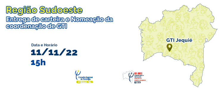 A Comissão de Interiorização (COMINTER) do Conselho Regional de Psicologia da Bahia (CRP-03) realizará mais uma entrega de Carteira de Identidade Profissional (CIP) no interior e consulta para indicação de gestão de Grupo de Trabalho de Interiorização (GTI). Dessa vez ocorre em Jequié, Região Sudoeste, nesta sexta-feira (11), às 15h, no auditório da clínica de Psicologia da UniFTC – Rua Dom Pedro II, 226, prédio da Cenomed, Centro.