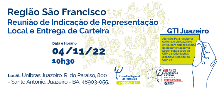 A Comissão de Interiorização (COMINTER) do Conselho Regional de Psicologia da Bahia (CRP-03) realizará mais uma entrega de Carteira de Identidade Profissional (CIP) no interior. A atividade acontece em Juazeiro, no 04 de novembro (sexta-feira), a partir das 10h 30, na Unibras/Juazeiro – Rua do Paraíso, 800, bairro Santo Antônio, Juazeiro. Na ocasião, também haverá indicação de representação local.