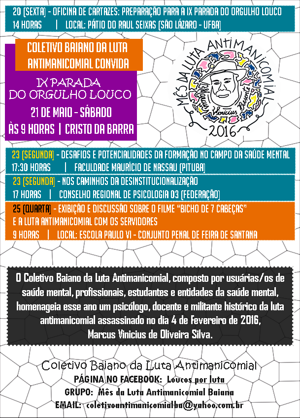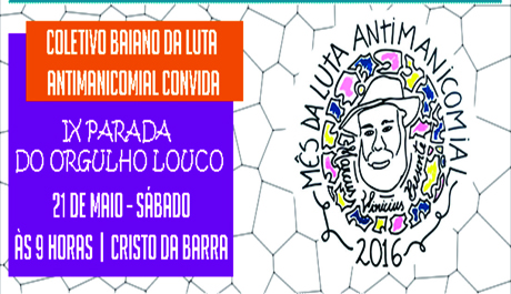 O Coletivo Baiano da Luta Antimanicomial realiza neste mês uma programação especial para comemorar o dia 18 de maio, em Salvador e no interior do estado. A grade conta com oficina de cartazes, exibição de filme, fóruns, mesas e outros eventos. Além disso, no dia 21, o Coletivo organiza a IX Parada do Orgulho Louco, a partir das 9h, no Cristo da Barra.