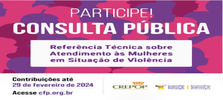 O Conselho Federal de Psicologia (CFP), por meio do Centro de Referência Técnica em Psicologia e Políticas Públicas (CREPOP), abriu consulta pública para que as(os) psicólogas(os) de todo o país possam contribuir com a futura publicação “Referências Técnicas para Atuação de Psicólogas(os) no Atendimento às Mulheres em Situação de Violência”.