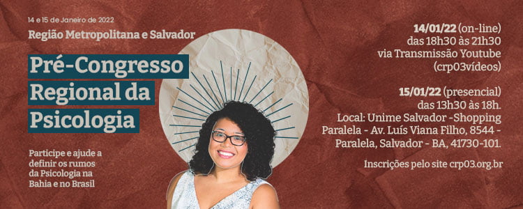 Nos dias 14 e 15/01/2022, o Conselho Regional de Psicologia da Bahia (CRP-03) realiza o Salvador e Região Metropolitana. O evento será semipresencial, por conta da pandemia da COVID-19.