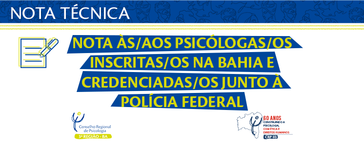 O Conselho Regional de Psicologia, Autarquia Federal criada pela Lei 5.766, de 20/12/1971, com a finalidade de orientar, disciplinar e fiscalizar o exercício da profissão de psicóloga/o e zelar pela fiel observância dos princípios éticos e disciplinares da classe, vem comunicar que, em função do previsto na Resolução CFP nº 001/2022 que regulamenta a Avaliação Psicológica para concessão de registro e porte de arma de fogo, as/os psicólogas/os inscritas/os no Estado da Bahia e credenciadas/os junto à Polícia Federal estão impedidos de realizar a Avaliação em questão desde que tenham vínculo com Centro de Formação de Vigilantes, Empresas de Segurança Privada, Escolas de Formação, Clubes de tiro ou com outras prestações de serviços com o candidato, observando os preceitos do Código de Ética Profissional. As/os profissionais nesta condição terão, a partir da data de publicação desta Nota, o prazo de até 60 (sessenta) dias para descontinuar a realização de suas atividades nesses locais conflitantes, providenciando assim um novo espaço para o exercício de suas atividades. Após expirado o prazo estipulado, o CRP-03 tomará as medidas necessárias e sanções junto aos profissionais que descumprirem a determinação a fim de garantir o cumprimento da Resolução supracitada.