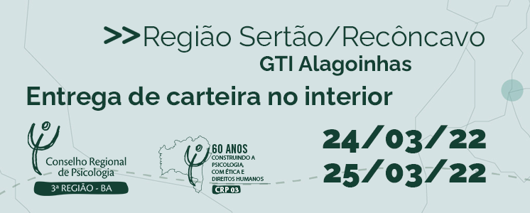 Nos dias 24 e 25/03/2022, o Conselho Regional de Psicologia da Bahia (CRP-03), por meio da Comissão de Interiorização (COMINTER), realizará entrega de Carteira de Identidade Profissional (CIP) em Alagoinhas.