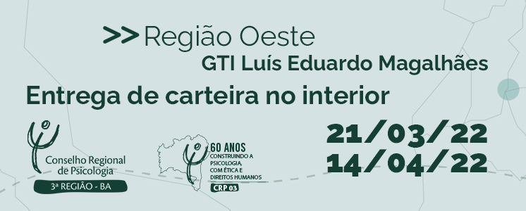 Nos dias 21/03 e 14/04/2022, o Conselho Regional de Psicologia da Bahia (CRP-03), por meio da Comissão de Interiorização (COMINTER), realizará entrega de Carteira de Identidade Profissional (CIP) em Luís Eduardo Magalhães.