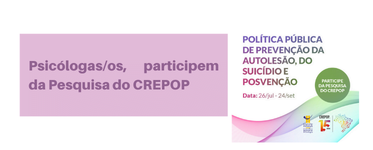 As/Os profissionais interessadas/os em participar das entrevistas nos CRPs sobre atuação de psicólogas/os na política pública de prevenção da autolesão e do suicídio, e posvenção, por videoconferência, devem preencher o formulário até dia 24 de setembro. A participação é voluntária e a realização das entrevistas dependerá da disponibilidade de acordo com a agenda de entrevistas do CREPOP no CRP-03. Para maiores informações entrar em contato através do e-mail [email protected].