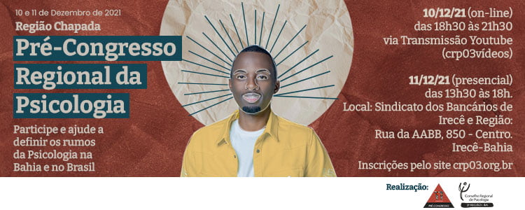 Está marcado para os dias 10 e 11 de dezembro, o Pré-Congresso Regional da Psicologia da Região Chapada. O evento realizado pelo Conselho Regional de Psicologia da Bahia (CRP-03) será semipresencial, por conta da pandemia da COVID-19.