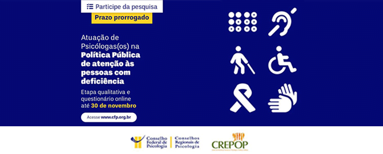 O Conselho Federal de Psicologia (CFP) prorrogou até, 30 de novembro, o prazo para que as/os psicólogas/os participem da pesquisa sobre a atuação da categoria na política pública de atenção às pessoas com deficiência.
