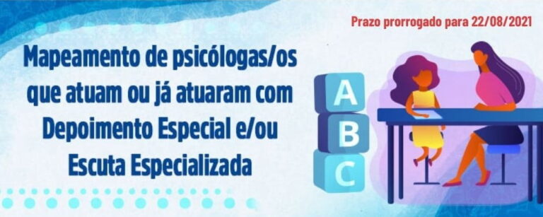 O prazo para responder ao mapeamento de psicólogas/os que atuam ou já atuaram com Depoimento Especial e/ou Escuta Especializada no território baiano foi prorrogado até 22 de agosto de 2021. O levantamento está sendo realizado pelo Conselho Regional de Psicologia da Bahia (CRP-03), através da Comissão de Direitos Humanos (CDH) e do Centro de Referência Técnica em Psicologia e Políticas Públicas (CREPOP).