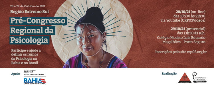 Nos dias 28 e 29/10/21, o Conselho Regional de Psicologia da Bahia (CRP-03) realiza o Pré-Congresso Regional da Psicologia da Região Extremo Sul. O evento será semipresencial, por conta da pandemia da COVID-19.