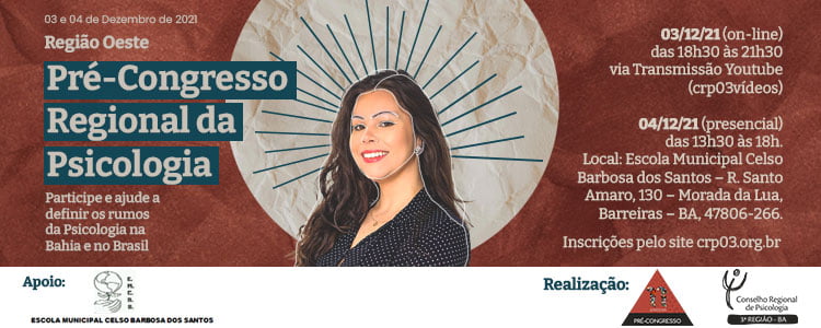 Nos dias 03 e 04 de dezembro de 2021, o Conselho Regional de Psicologia da Bahia (CRP-03) promove o Pré-Congresso Regional da Psicologia da Região Oeste. O evento será semipresencial, por conta da pandemia da COVID-19.
