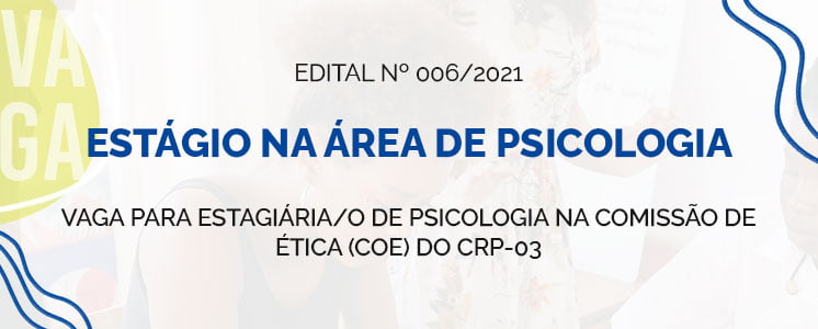 O presidente do Conselho Regional de Psicologia da Bahia (CRP-03), autarquia Federal de Fiscalização Profissional, no uso das atribuições legais e regimentais e nas condições estipuladas neste Regulamento, em conformidade com a Constituição Federal e demais disposições atinentes à matéria, torna pública a realização de processo seletivo para preenchimento de 01 (uma) vaga de Estágio em Psicologia na Comissão de Ética (COE) desta autarquia.