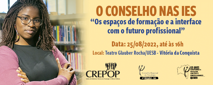 O CRP-03 promove hoje (25/08) a atividade “O CONSELHO NAS IES: Os espaços de formação e a interface com o futuro profissional”, das 8h às 16h, no Teatro Glauber Rocha da UESB, em Vitória da Conquista.