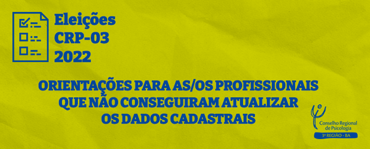 A atualização de cadastro para fins eleitorais foi encerrada, entretanto as/os psicólogas/os que não conseguiram realizar o procedimento ainda poderão votar na Consulta Nacional para o Conselho Federal de Psicologia (CFP) e eleições do Conselho Regional de Psicologia da Bahia (CRP-03). A partir do dia 20 de agosto serão enviados os links de acesso à votação por email ou SMS. Caso a/o psicóloga/o não receba o link, ela/e pode gerar a senha através do site das eleições: www.eleicoespsicologia.org.br. Se a/o profissional não conseguir em nenhuma dessas tentativas, ela/e deve se dirigir a um dos pontos de votação disponíveis, nos dias, horários e locais informados abaixo: