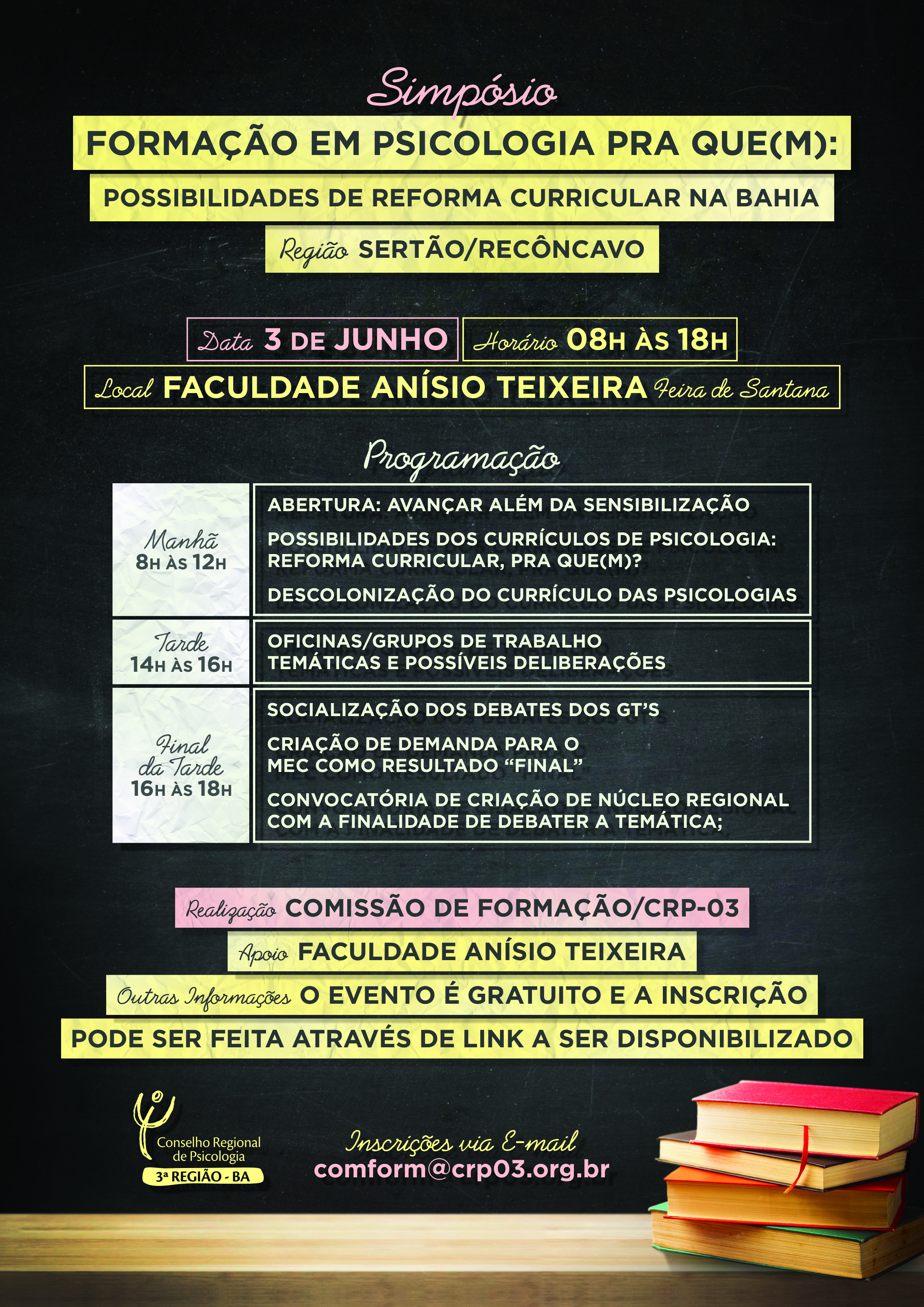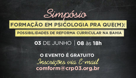Debater a formulação de um currículo para o curso de Psicologia coerente com realidade local é o objetivo do seminário Formação em Psicologia pra que(m): Possibilidades de Reforma Curricular na Bahia. O evento será realizado no dia 3 de junho, às 8h, na Faculdade Anísio Teixeira em Feira de Santana.