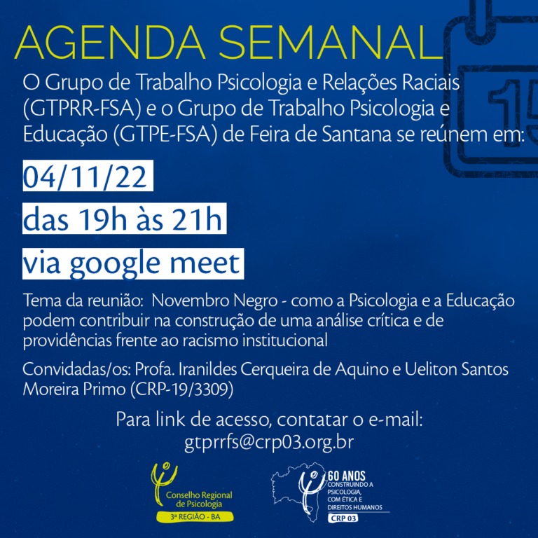 Tema: Novembro Negro – Como a Psicologia e a Educação podem contribuir na construção de uma análise crítica e de providências frente ao racismo institucional.