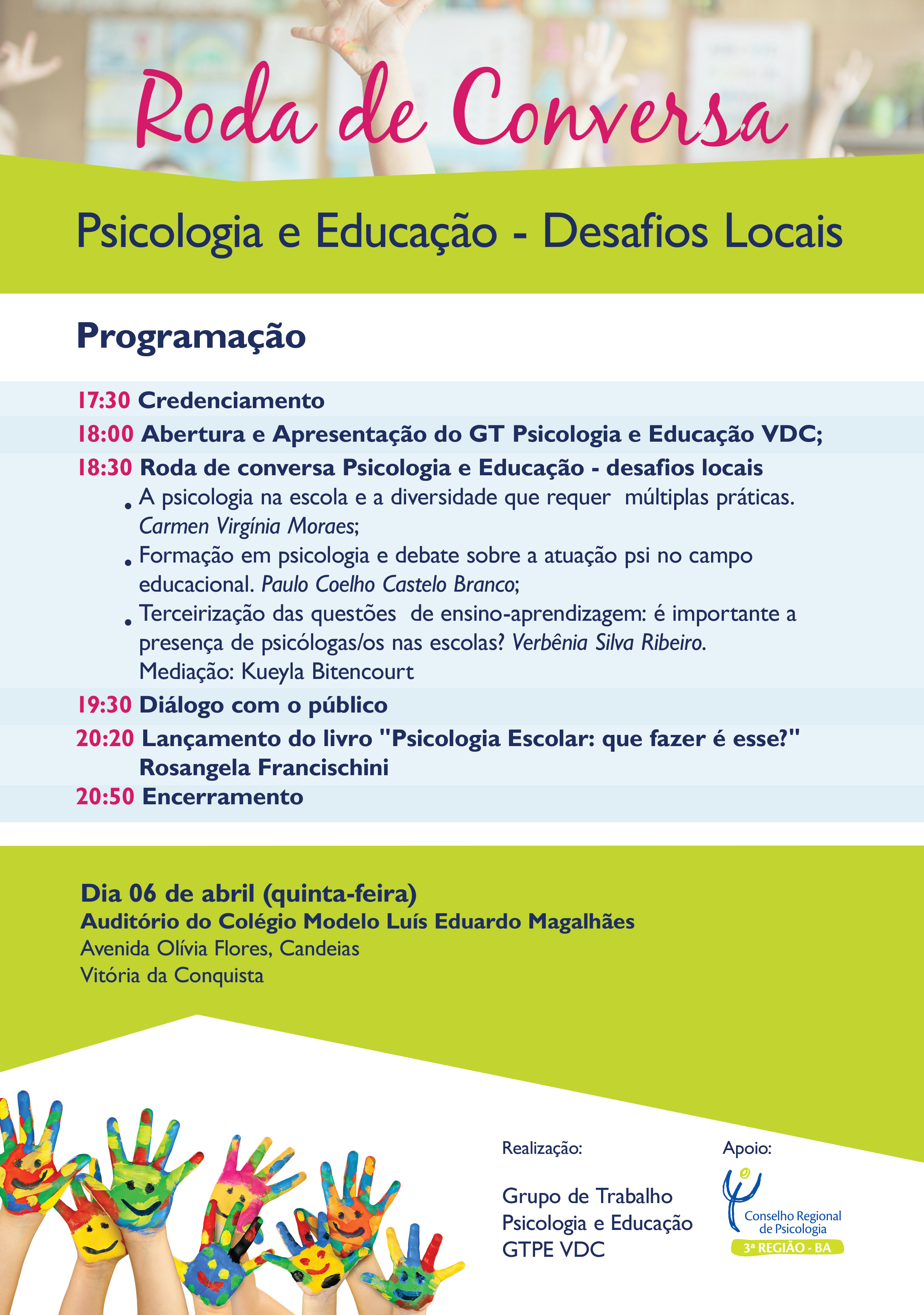A Roda de Conversa Psicologia e Educação – Desafios Locais acontece no dia 06 de abril, na cidade de Vitória da Conquista. A atividade será realizada, às 17h30, no auditório do Colégio Modelo Luís Eduardo Magalhães e é o primeiro grande evento do Grupo de Trabalho Psicologia e Educação de Conquista. A criação do GT na cidade faz parte de um dos princípios da Gestão que é de descentralizar as ações da Sede e levá-las ao interior do estado.