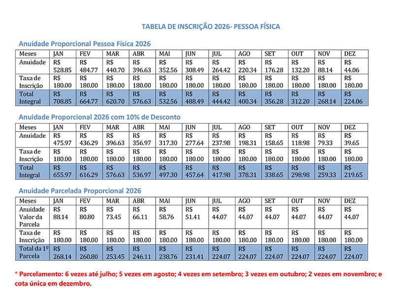Anuidade proporcional ao mês do Registro Profissionais poderá ser quitada em até 06 (seis) parcelas, sem desconto, será incluído na primeira parcela o valor da taxa de inscrição.