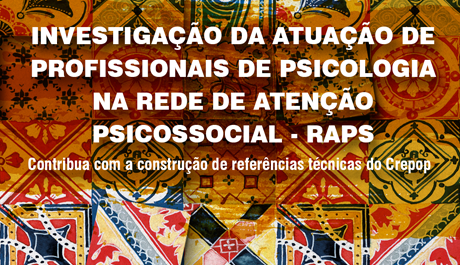O Centro de Referências Técnicas em Psicologia e Políticas Públicas (Crepop) vai iniciar, no dia 28 de agosto, coleta de dados sobre a atuação de profissionais da Psicologia na Rede de Atenção Psicossocial (RAPS). A pesquisa pretende resultar na elaboração de mais uma referência técnica do Crepop para o exercício profissional.