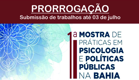O prazo de submissão de trabalhos para a I Mostra de Práticas em Psicologia e Políticas Públicas da Bahia foi estendido para o dia 03 de julho de 2016. A atividade acontece de 10 à 12 de agosto, na Uneb, em Salvador. A Mostra de Práticas é um evento para compartilhamento, troca e construção de experiências e práticas sobre a atuação da Psicologia nos diversos âmbitos das Políticas Públicas, seja em ações assistenciais, de gestão e/ou controle social. É um espaço que tem por objetivo ancorar as diversas práticas a um fazer ético-político referenciado no social, tomando este fazer como elemento capaz de integrá-las em torno de um projeto emancipatório de Psicologia.