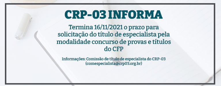 O Conselho Regional de Psicologia da Bahia informa que termina em 16/11/2021, o prazo para solicitação do título de especialista pela modalidade concurso de provas e títulos do Conselho Federal de Psicologia.