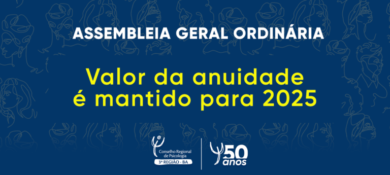O Conselho Regional de Psicologia da Bahia (CRP-03) realizou na manhã do dia 31 de agosto de 2024, a Assembleia Geral Ordinária no formato on-line, a fim de aprovar o valor da da anuidade, taxas e emolumentos para o exercício de 2025. Com a participação de 31 psicólogas/os, a maioria presente votou pela manutenção do valor do tributo para o ano seguinte.