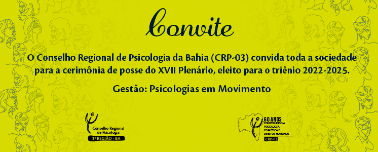 Em 23 de setembro de 2022, o Conselho Regional de Psicologia da Bahia (CRP-03) realizará a Cerimônia de Posse do XVII Plenário, para o triênio 2022-2025, gestão do coletivo Psicologias em Movimento. O evento terá início às 18h30, no Grande Hotel da Barra, localizado na Rua do Forte São Diogo, n° 2, Barra, Salvador-BA.